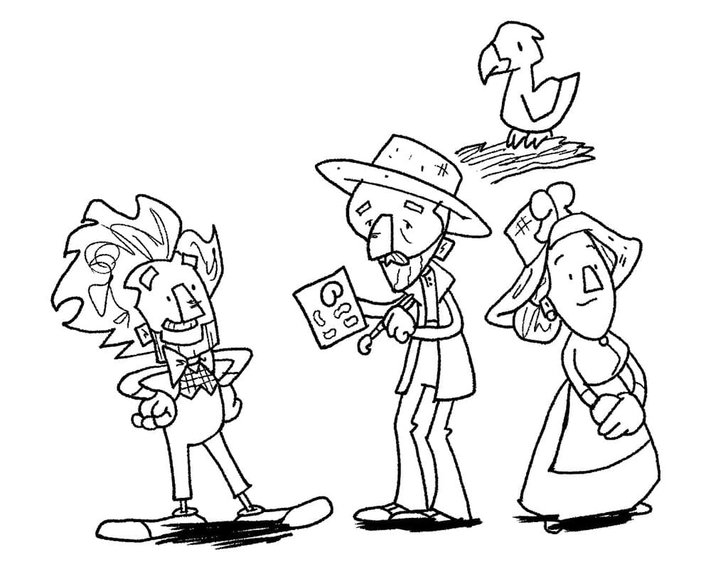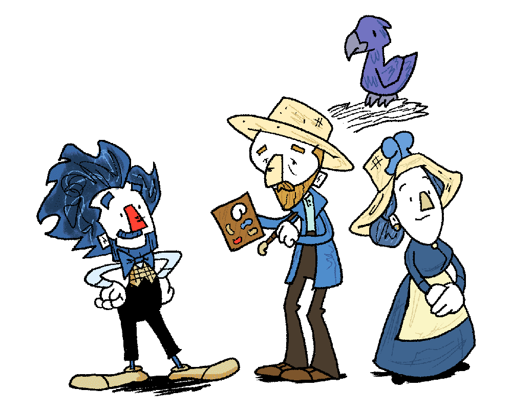 E na história o Olirrô vai pro mundo das pinturas de Van Gogh. Deixo abaixo um design de personagens que fiz pro livro.